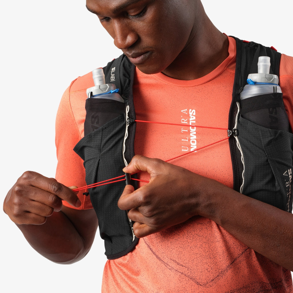 - 2 front flask pockets: Designed to fit Salomon soft flasks, these front pockets limit bouncing. Top elastic loops secure your flasks and keep them ready to drink.