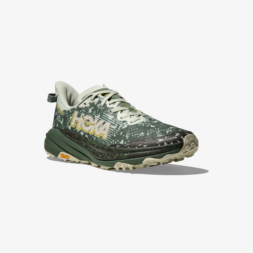 A workhorse for sloppy, wet conditions. The Speedgoat 6 GTX is now even more comfortable with GORE-TEX's Invisible Fit waterproof membrane for a lighter, more flexible construction to help avoid pressure points. Grounded in a Vibram® Megagrip with Traction Lug outsole for increased bite on loose soil, this trail icon employs a foot-cradling heel bolster, lightweight, responsive midsole compound, and a protective toe rand for charging through the rough stuff. Bring it, weather.