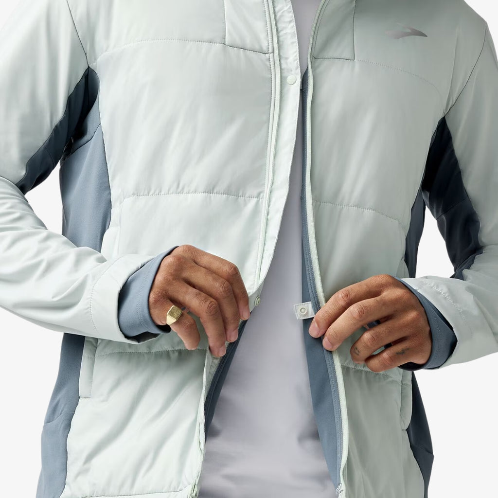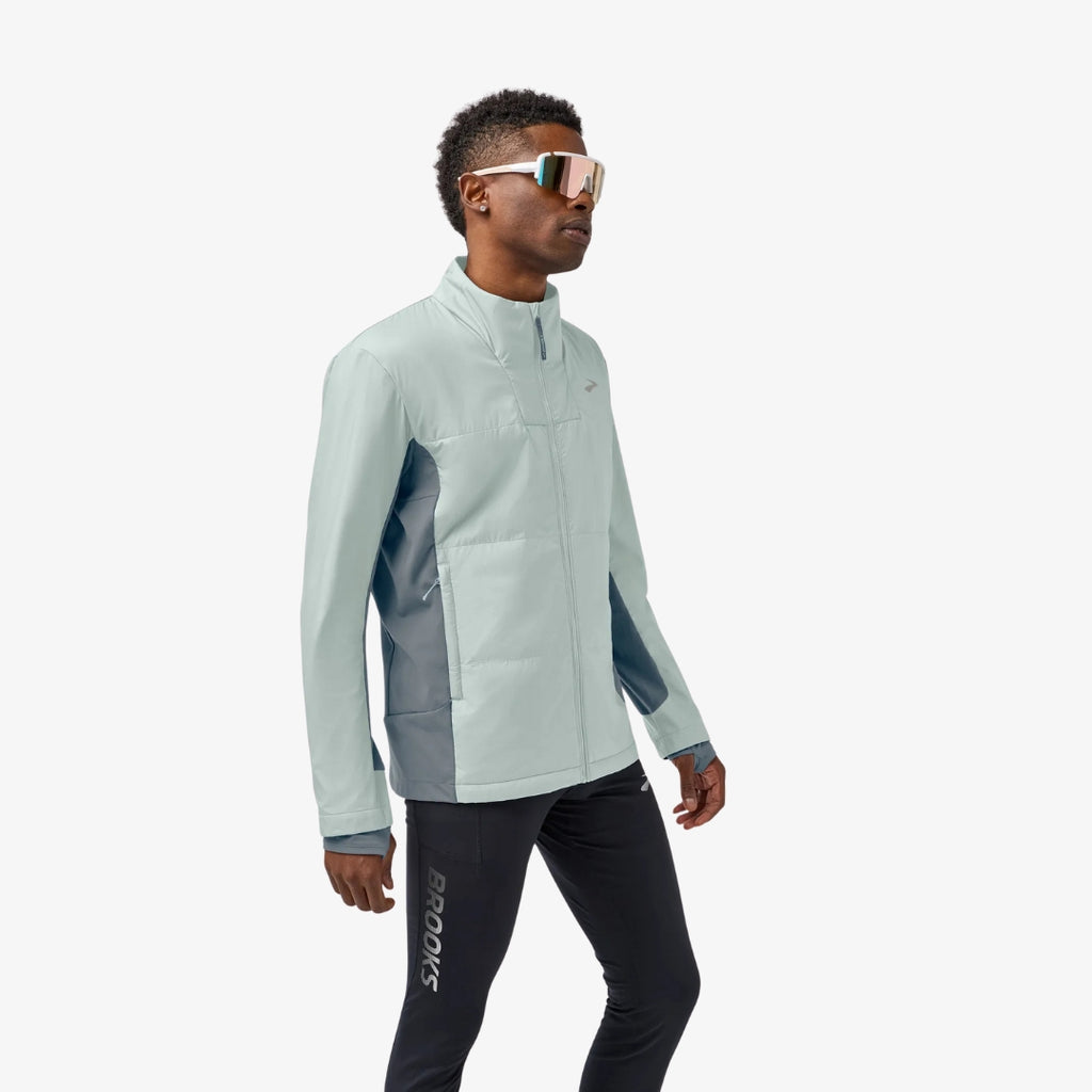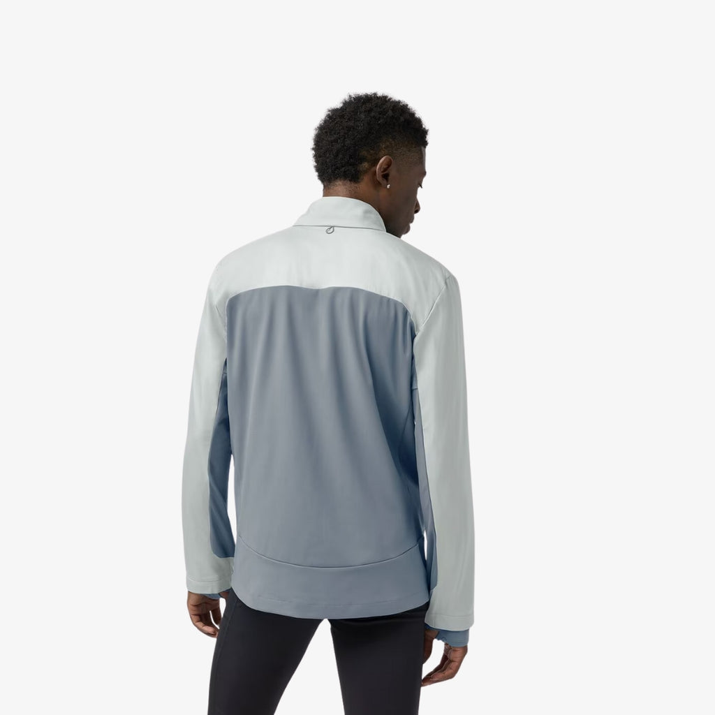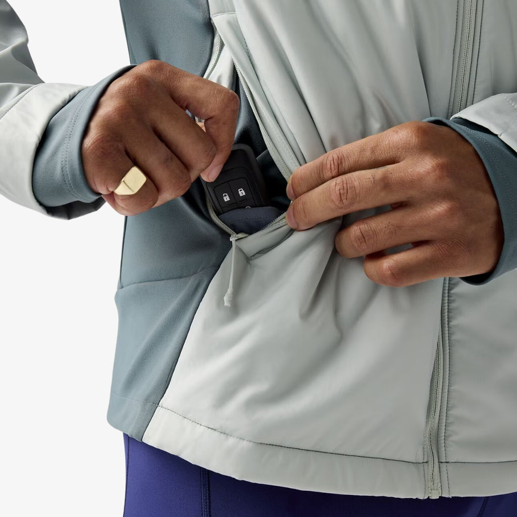 A men's jacket designed for running in cold, wet weather, the Shield Hybrid Jacket 3.0 features windproof, water-repellent protection. The lightweight 80g THERMOLITE® insulation provides warmth, while fitted cuffs and a tall collar help hold that warmth close.