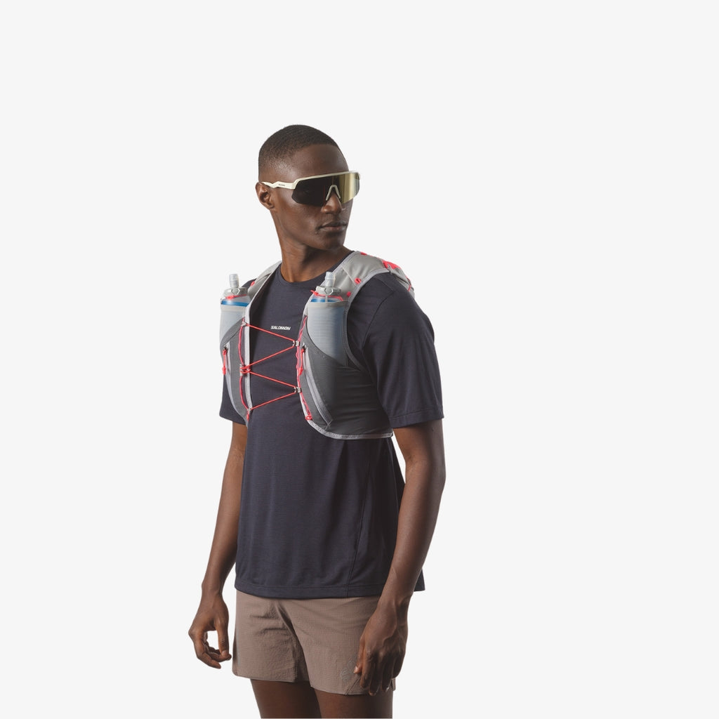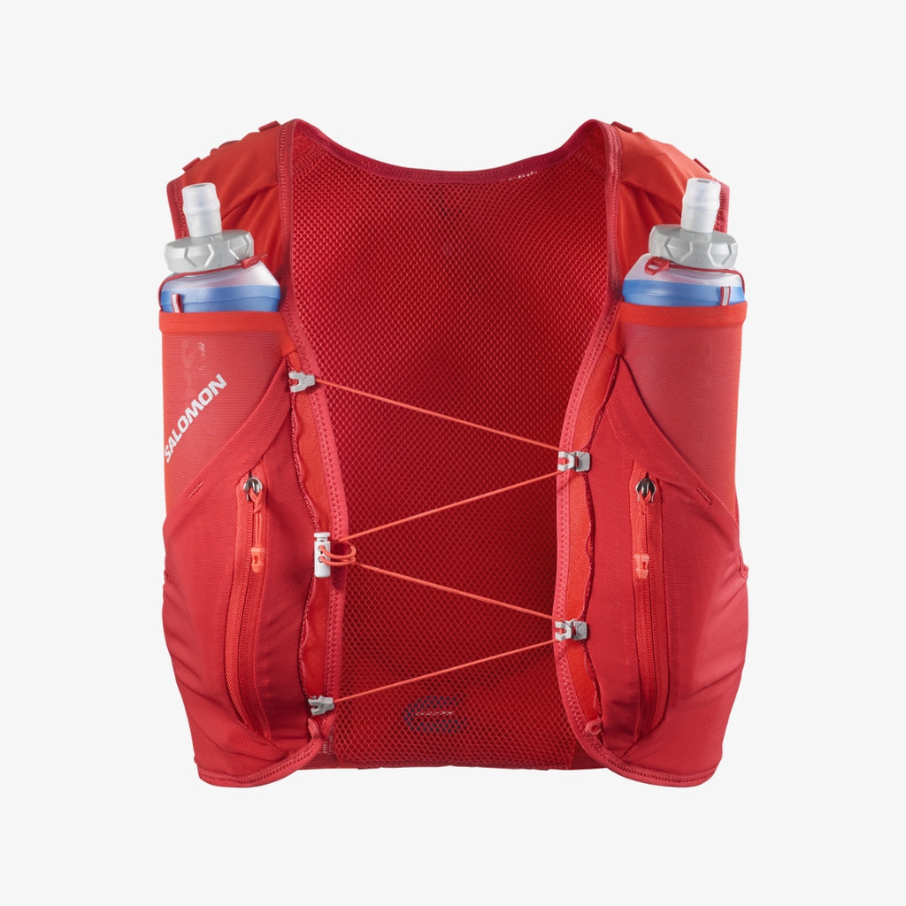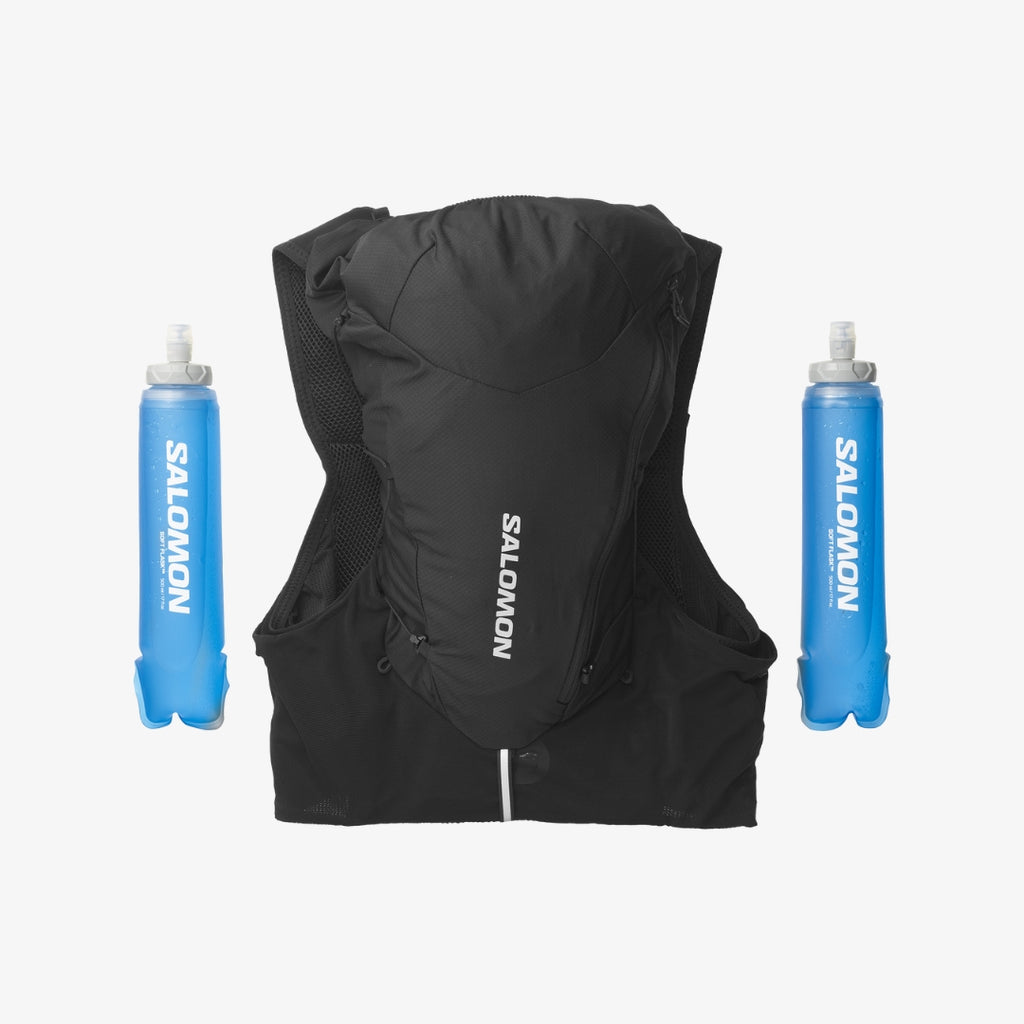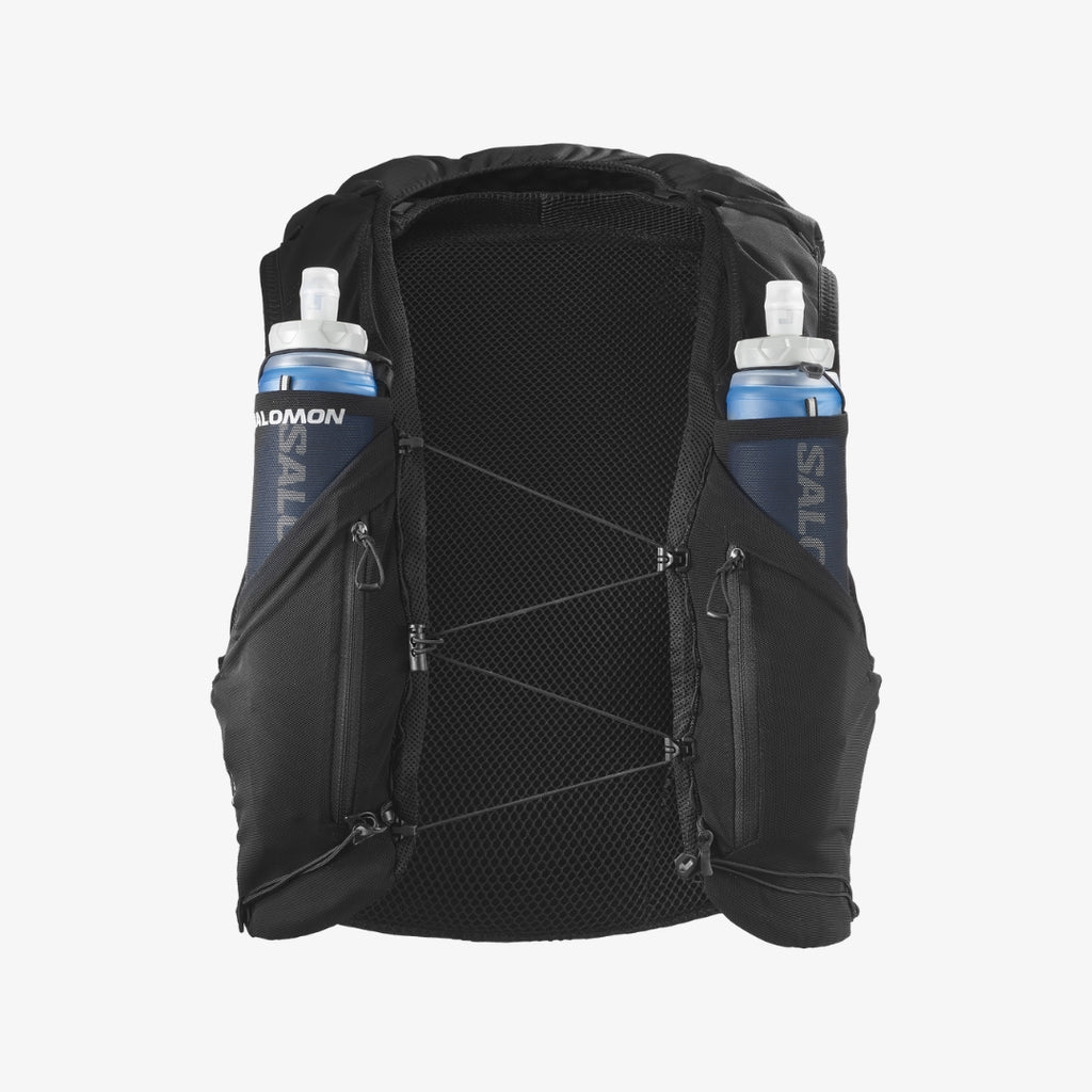 - 2 front flask pockets: Designed to fit Salomon soft flasks, these front pockets limit bouncing. Top elastic loops secure your flasks and keep them ready to drink.