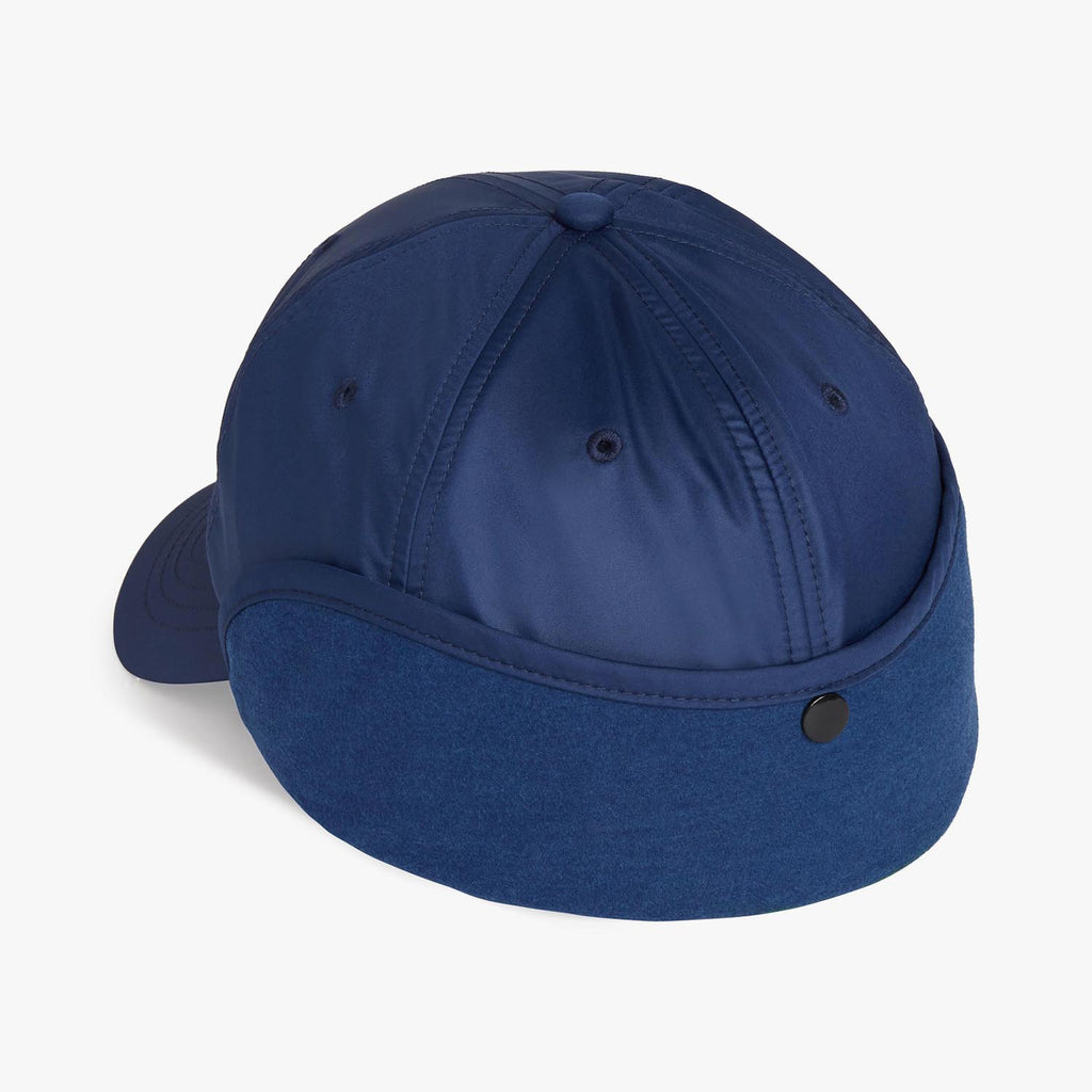 - Lined ear flap folds down for coverage or snaps up when not needed